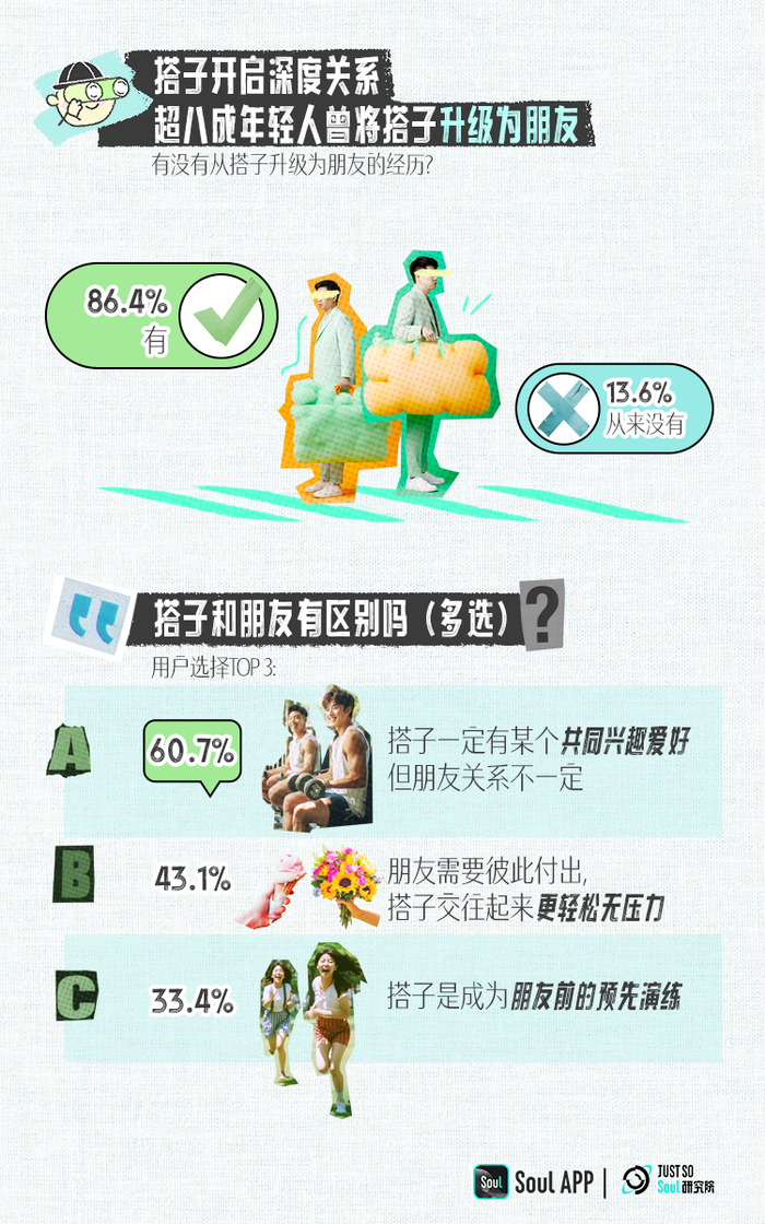年轻人为什么热衷找“搭子”?“搭子”和朋友不一样吗?短暂的陪伴能否升级为深度关系?近日,Just So Soul研究院基于社交平台Soul App站内用户,发起了一项“搭子”社交调研,共收回3136份真实且有效的反馈。从找“搭子”的人群、原因、方式、标准等多个维度进行梳理与分析,《2023年轻人搭子社交报告》(以下简称“报告”)正式发布,深度解读当下年轻人对待“搭子”社交的态度,以及这种新型社交方式所带来的新趋势。