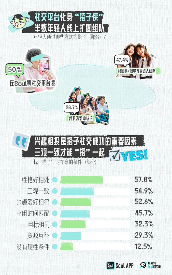 互联网将山南海北的人们聚集在一起,为找“搭子”降低了门槛,“人均社恐”的年轻人们也更愿意通过线上方式建立连接、获得归属感。报告显示,高于在同事/同学等身边人中组队(47.4%)、线下活动中寻找“搭子”(28.7%)的选择,大家捕捉“搭子”的主要方式还是通过如Soul这种兴趣交友类型的社交平台,半数年轻人线上扩圈组队。