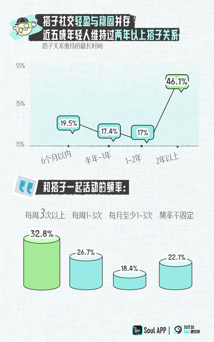 虽然面对“搭子”关系,年轻人或多或少有些纠结,不过从报告数据看,“搭子”友谊轻盈与稳固并存,近五成年轻人维持过两年以上“搭子”关系。