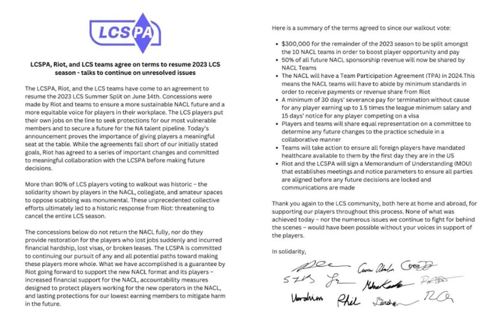 和另两场罢工的无疾而终不同,在公告里,LCSPA以胜利者的姿态列出了他们为选手争取到的权益,并用 “历史性”这样的词汇,来形容这次他们和拳头间的斡旋。
