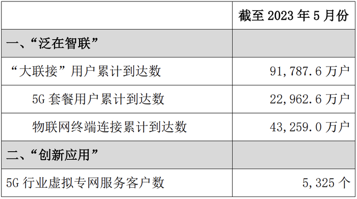 截止2023年5月份,“大联接”用户累计达到9.17876亿户,同比增加了892万户;