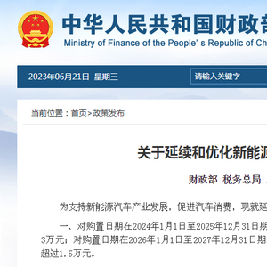 红星资本局6月21日消息,财政部、税务总局、工业和信息化部(以下简称三部门)近日联合发布《关于延续和优化新能源汽车车辆购置税减免政策的公告》(以下简称《公告》)。对购置日期在2024年1月1日至2025年12月31日期间的新能源汽车免征车辆购置税,其中,每辆新能源乘用车免税额不超过3万元;对购置日期在2026年1月1日至2027年12月31日期间的新能源汽车减半征收车辆购置税,其中,每辆新能源乘用车减税额不超过1.5万元。