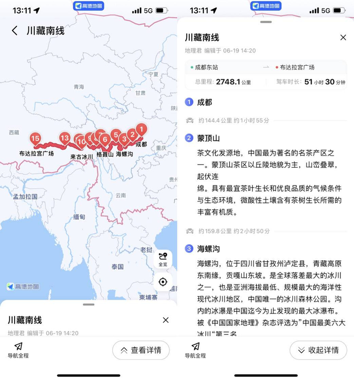 进一步点击页面中的“路线详情”后,用户则可以查看该自驾路线的途经点,以及所对应的详细介绍,以便根据自身实际情况和喜好,选择停车和游玩节点。