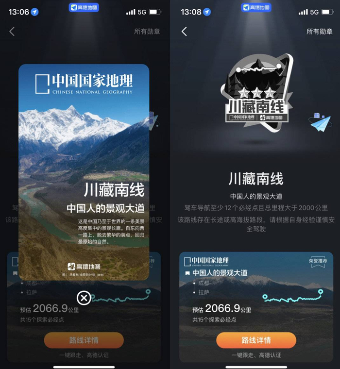 而针对实际前往的用户,《中国国家地理》和高德地图也将共同颁发对应路线的“实走认证”高德虚拟勋章(部分用户还有机会获得精美实体勋章车贴),并且后续在App内可随时查看各自的自驾游“人生探索”路线。