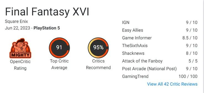 《最终幻想16》媒体评测解禁,目前基于 63 家媒体的 Metacritic 均分为 88 分,基于 42 家媒体的 OC 评分为 91 分。其中 IGN 9 分,GameSpot 9 分。