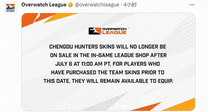 就在今天早晨,守望先锋联赛(OWL)官方正式宣布中国队伍成都猎人队永久退出联盟,其战队相关皮肤也将于7月6日从游戏中下架,从此绝版。