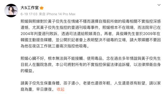 昨(22日)晚,大S经纪人发声明驳斥不实传闻,并表示已请律师搜证。