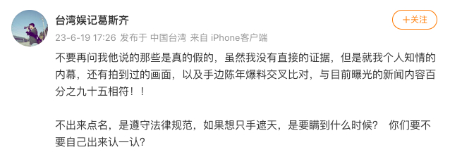 此前,在黄子佼事件爆发时,葛斯齐就曾表示,自己“没有直接的证据,但是就我个人知情的内幕,还有拍到过的画面,以及手边陈年爆料交叉比对,与目前曝光的新闻内容95%相符!”