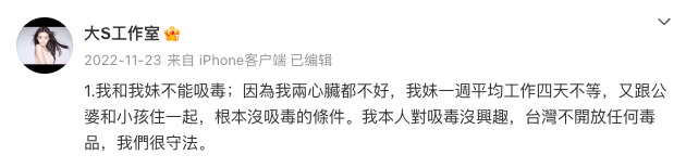 对此,大S经纪的人表示,“大家以常识想想,如果长期天天用药的话,有可能20年间直到大S离婚之前,会完全没有吸毒传闻吗?这20年姐妹俩天天用药的情况下,外表会长成什么样?还能够思路清晰、照常主持节目、出席代言活动?更不用说还参与了2部实境节目录影,被数十台机器24小时拍摄着?”
