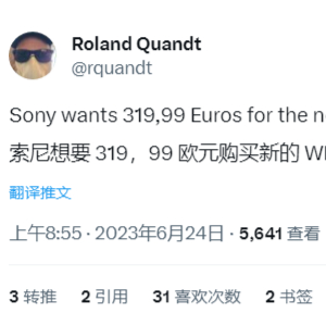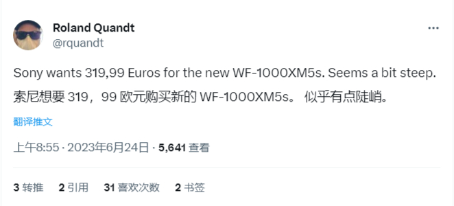 IT之家 6 月 25 日消息,消息源 Roland Quandt 近日分享了索尼 WF-1000XM5 耳机在欧洲市场的售价,为 319.99 欧元(IT之家备注:当前约 2502 元人民币),比前代 279 欧元贵出 15%。