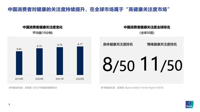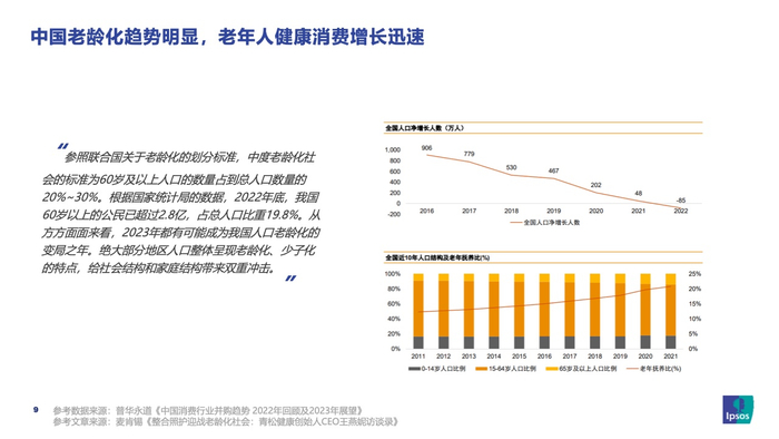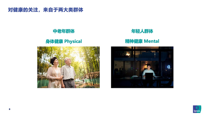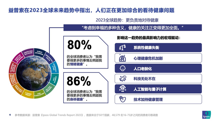 消费者对健康问题的看法正在变得更加综合和全面,据益普索调研,在全球市场上,80%的消费者认为情绪健康更加需要受到关注,86%的消费者认为需要做更多的事情去关注自身身体健康。在中国,老龄化趋势明显,因此保健需求也相应增加;与此同时,年轻人面临更大的社会压力,也表现出强烈的关注情绪健康的意愿。