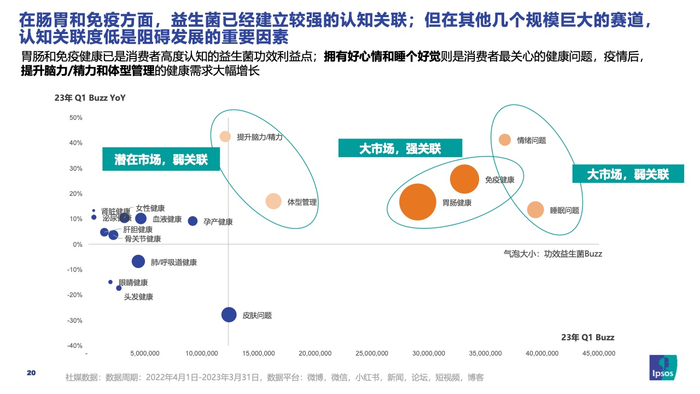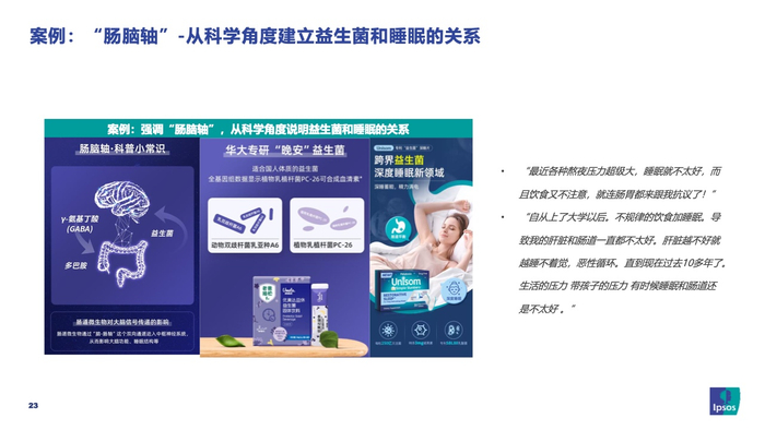 在消费者心智中,“解决睡眠问题”和“食用益生菌”的关联度相对较低,因此填补认知和产品选择之间的空缺,正是益生菌产品沟通的发展机会点。