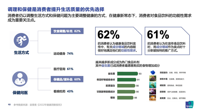 同时,在疫情过后的健康新常态下,消费者对食品饮料的功能性需求增加,营养补剂添加已成为饮食行业的流行趋势。据调研数据显示,益生菌已成为消费者最愿意购买的健康食品添加成分之一。