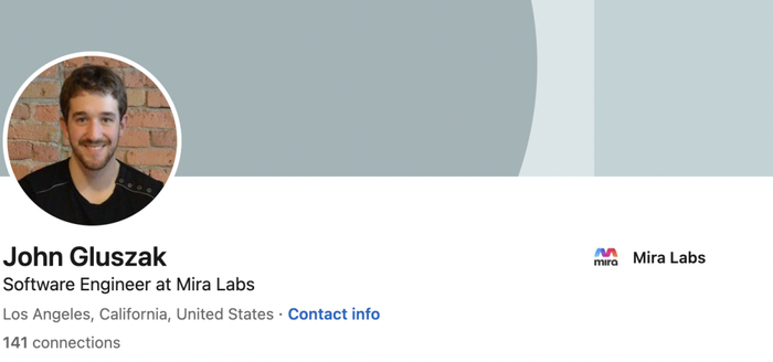 John Gluszak毕业于加拿大女王大学,专业是物理工程。他曾是MFive Labs的创始人和首席产品官,后台去Daqri工作,担任软件工程师一职,2018 年正式加入Mira。