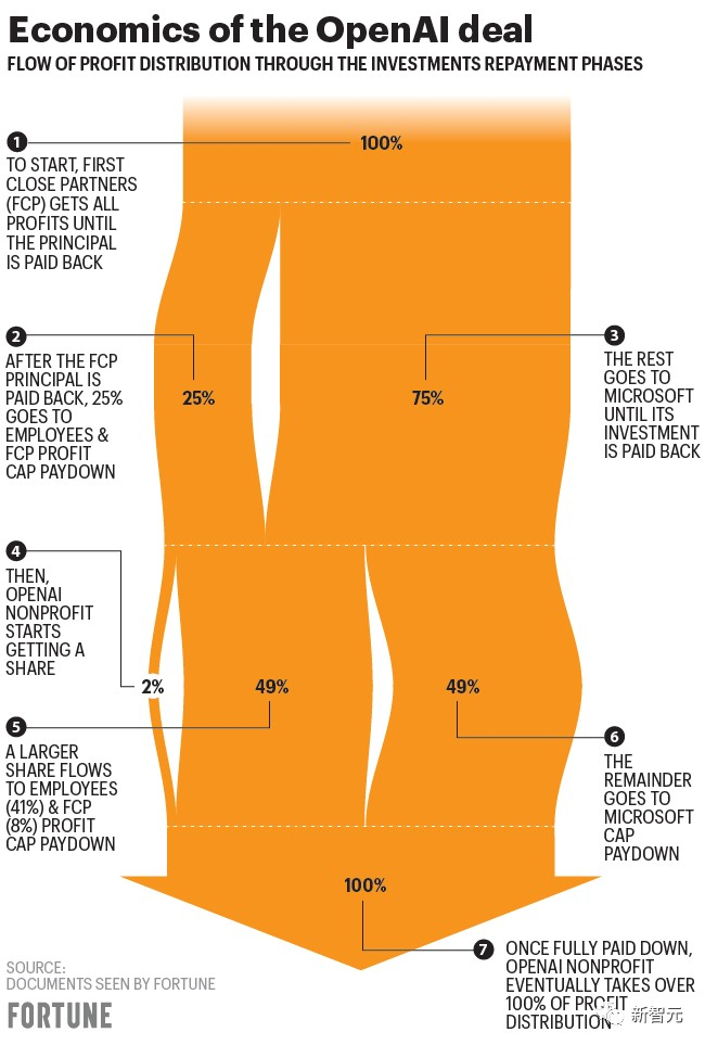 3. 在OpenAI的利润达到920亿美元之后,微软的持股比例下降到49%。剩余部分利润由其他风险投资者和OpenAI的员工分享。
