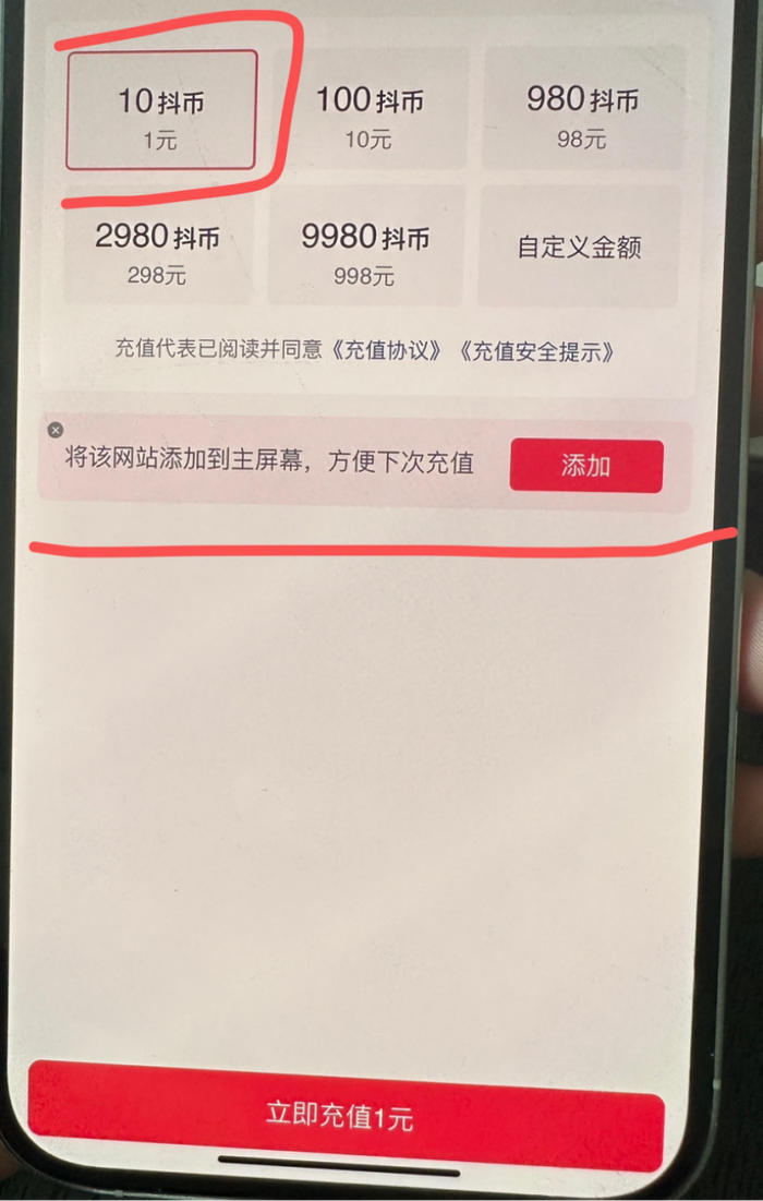 意思就是可以在苹果手机抖音应用内顺畅实现花1块钱买10个抖币?