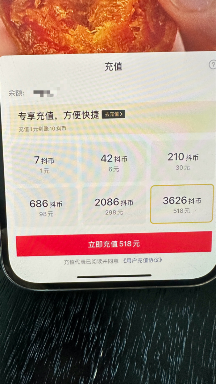 大壮用的是苹果手机,平常打赏都是直接在APP里充钱购买虚拟币,按照1元买7个抖币购买,但抖音网页版和安卓版是可以按照1元买10个抖币进行购买。