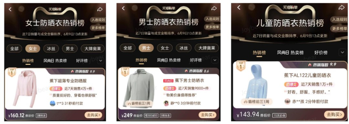 除此之外,蕉下超薄专业防晒服、蕉下男士防晒服、蕉下AL122儿童防晒衣分别占据女士、男士、儿童防晒衣子类目热销榜首位,可以说是多线开花。
