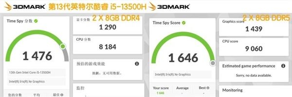 从上面的测试数据可以看到,同一品牌的两台电脑,同样都是第13代酷睿i5-13500H处理器,显卡都是英特尔锐炬核显(80EU),配置DDR4内存电脑的3Dmark Time SPY得分要低于使用DDR5内存产品,再考虑到后续的使用与升级问题,本着买新不买旧的原则,选购DDR5内存电脑更合适。