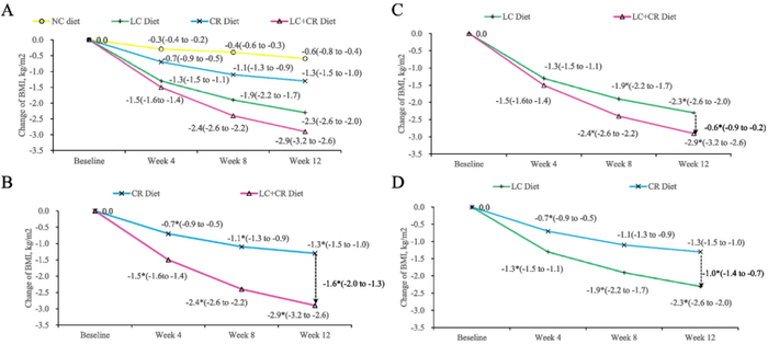 该研究发现,与对照组相比,限制碳水化合物和热量(LC + CR)组体重减轻幅度最大,减肥效果是最佳。当比较CR组和LC组之间的减肥效果时,作者发现低碳水化合物LC组饮食降低BMI效果比限制热量CR饮食更强(见图2),并减少了更多的腰围和体脂。此外,这三种饮食干预方案均能改善血糖、降低总胆固醇。