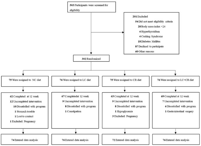 受试者均采用随机入组原则,以 1:1:1:1 的比例,随机分配到不限制能量摄入的正常饮食对照(normal control diet, NC)组、限制热量(calorie-restricteddiet, CR)组、低碳水化合物(low-carbohydrate diet, LC)、限制碳水化合物和热量(LC + CR diet)组。