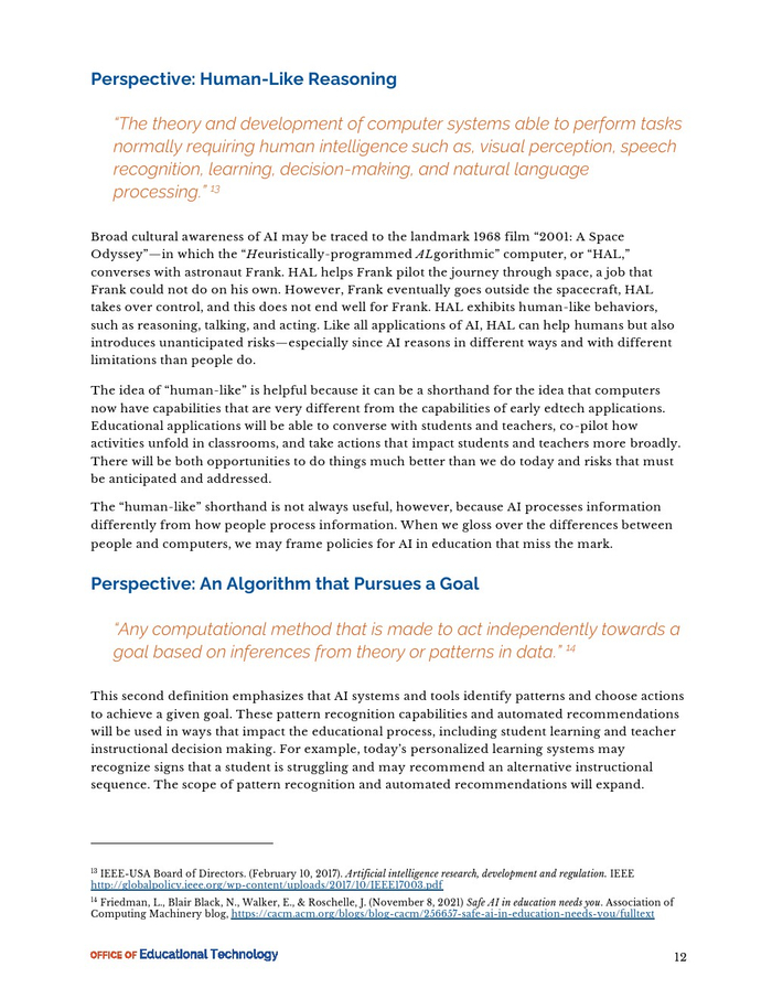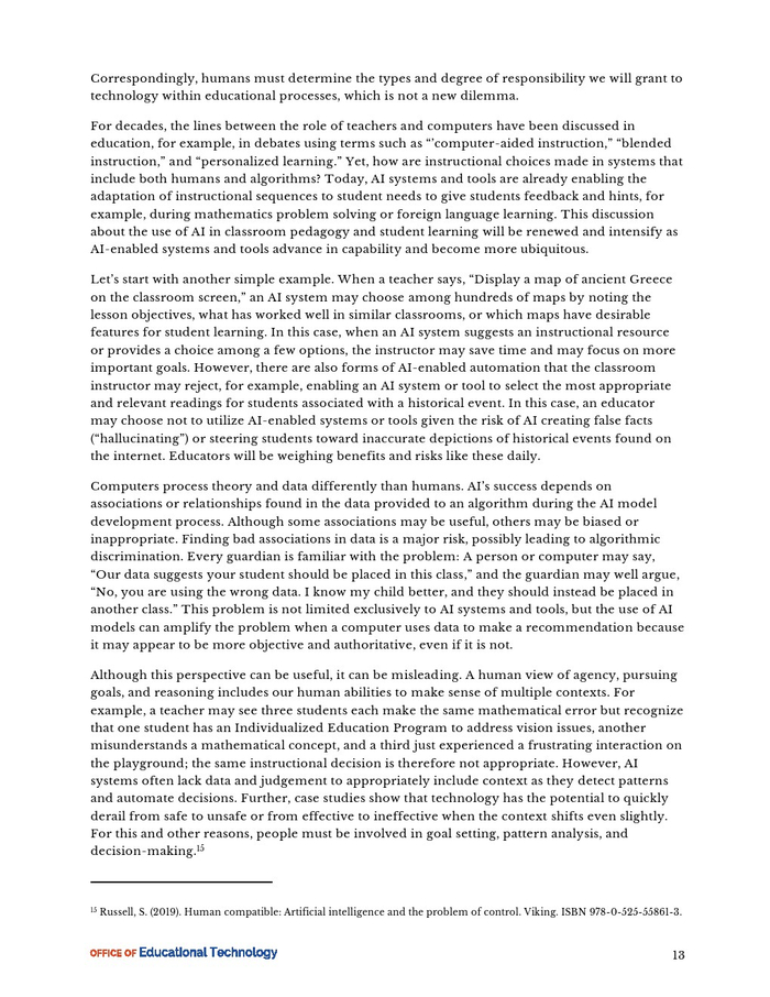 人工智能可以定义为“基于关联的自动化”。当计算机根据数据中的关联自动进行推理时,人工智能的两个基本转变就会发生,并使计算超越传统的教育技术:(1)从捕获数据到检测数据中的模式;(2)从提供访问教学资源到自动化有关教学和其他教育过程的决策。检测模式和自动化决策是可以委托给计算机系统。开发人工智能系统的过程可能会导致检测模式方面存在偏见,以及在自动化决策方面存在不公平。因此,教育系统必须管理人工智能系统的使用。