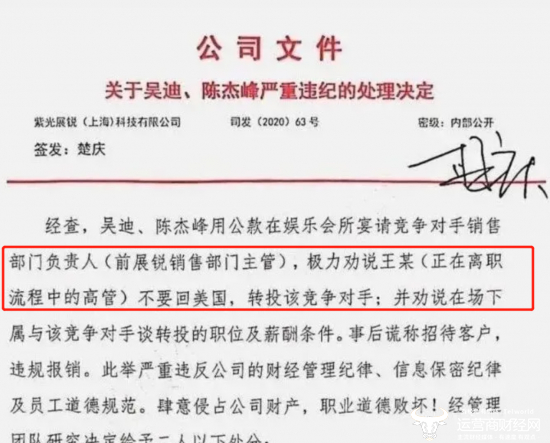 彼时他在紫光展锐担任泛连接事业部总经理,2020年4月20日,紫光展锐发布了内部文件,为《关于吴迪、陈杰峰严重违纪的处理决定》,其中显示,吴迪、陈杰峰用公款在娱乐会所宴请竞争对手销售部门负责人(前展锐销售部门主管),极力劝说王某(正在离职流程中的高管)不要回美国,转投该竞争对手。