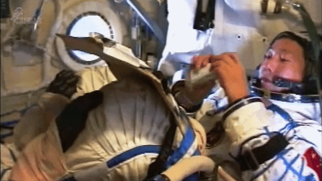 为了这一餐,大家在进入太空之前专门增加了“吃喝训练”。他们要训练怎么喝水,怎么用风机来收拾残渣,怎么把餐盘绑在腿上或者固定在某个地方……