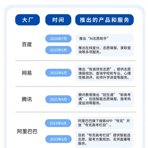 这其中不乏多家互联网大厂的身影。南方财经全媒体记者梳理发现,百度、阿里巴巴、网易、抖音等企业在近几年陆续涉足高考志愿业务,推出名师填报指导、智能志愿填报等一系列内容和服务。