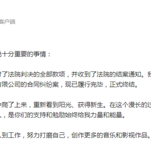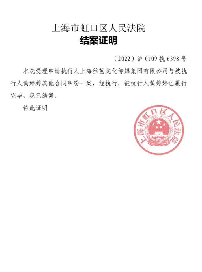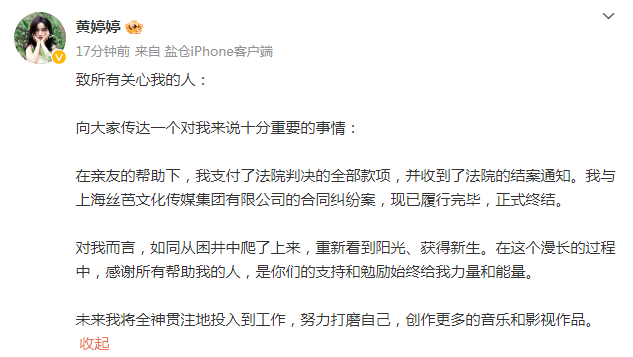 今(29)日,前人气偶像团体SNH48成员黄婷婷发文表示,在亲友的帮助下,已支付完法院判决的全部款项,并收到结案通知,“我与上海丝芭文化传媒集团有限公司的合同纠纷案,现已履行完毕,正式终结。”