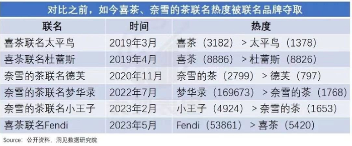 就这两点来看,喜茶基本处在中间,上不上下不下的尴尬。而作为交叉验证,也可以看到,此前各种联名活动中,喜茶、奈雪的热度与联名品牌旗鼓相当,甚至略胜一筹。但近两年它们的热度,被联名品牌远远甩在了后面。