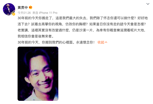 今(30)日是黄家驹逝世30周年纪念日,Beyond乐队成员叶世荣写下:“怀念家驹”,黄贯中也发文表示:“30年前的今天你搬走了,这是我们最大的失去……30年前的今天,你搬到我们的心里面。永远怀念你!”