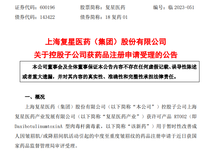 和在研发阶段就官宣入局肉毒素产品的企业不同的是,复星医药此前并未有过多关于肉毒素产品布局的信息披露。直到今年4月,复星医药一纸公告宣布,控股子公司上海复星医药产业发展有限公司(以下简称“复星医药产业”)获许可产品RT002(即DaxibotulinumtoxinA型肉毒杆菌毒素)的药品注册申请获国家药监局审评受理,国内肉毒素市场再添新玩家,并与爱美客同台竞速上市。