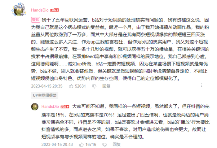 首先就是输出专业、深度的中长视频UP主表示不服。比如B站头部UP主@智能路障就曾发布视频《B站到底应该如何逆天改命?做了四年UP主的一些感想》,花了50多分钟表达B站被短视频侵蚀自身特色,使其定位模糊。很讽刺的是,其热评第一就是一位用户表示“自己一条十几秒的视频,拥有五十万的播放量,快速从两位数涨粉到五位数,何德何能啊!”