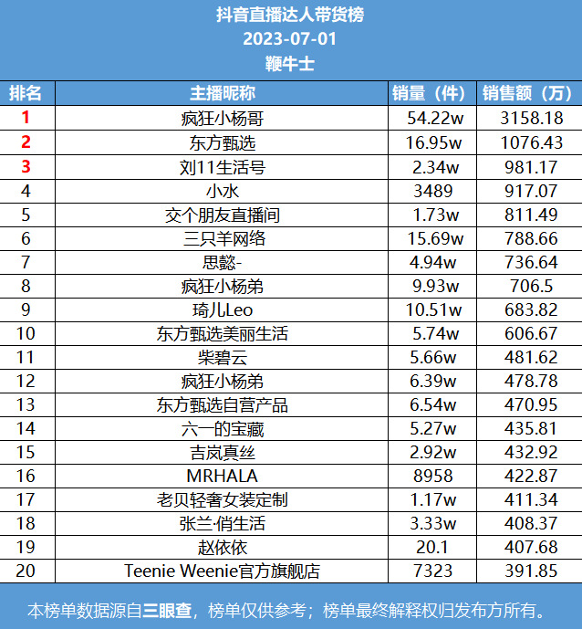 7月1日,抖音直播达人带货榜一是疯狂小杨哥,销售额3158.18w;榜二东方甄选,销售额1076.43w;榜三刘11生活号,销售额981.17w。