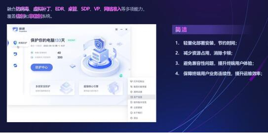 简洁:TrustOne融合了防病毒、 虚拟补丁、EDR、桌管、SDP、VP、网络准入等多项能力,同时覆盖了信创和非信创系统。TrustOne采用的轻量化部署安装可大幅节约时间,同时减少资源占用,消除卡顿现象。指标显示,其安装包大小下降95%、安装时间缩减 94%、CPU占用 下降97%、内存占用下降89%。同时,TrustOne在一体化运维管理中采用的模块化模式,避免了兼容性问题,进而全面保障终端用户业务连续性,运维效率得到有效提升。