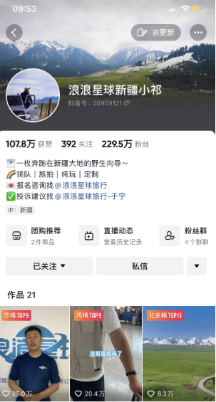 今日,鞭牛士观察到,一位在新疆做导游的99年东北小伙小祁从600个粉丝一夜涨粉190多万,而且现在还在迅速吸粉中。截止目前,该东北小伙抖音平台粉丝量229.5万,获赞量107.8万。