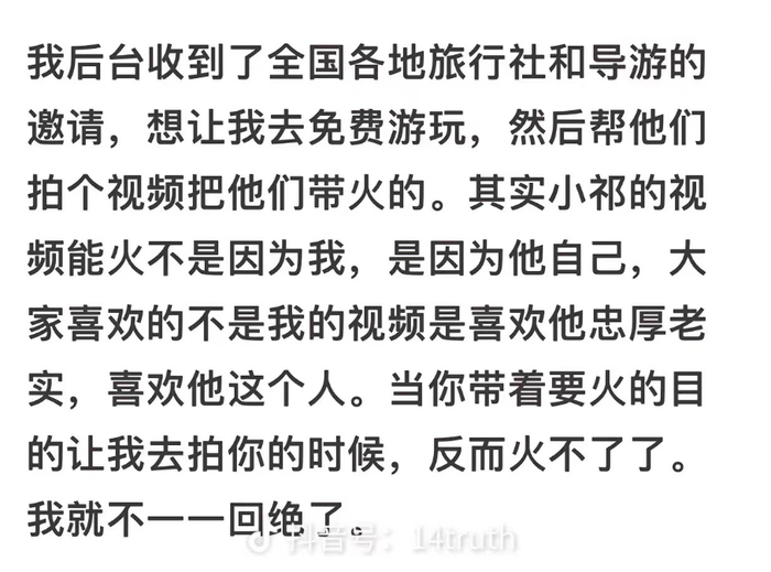 7月1日上午,针对“小祁爆火”一事,路人甲回应称“没想到发的一个短视频有这么大的影响,一开始只是觉得这个小伙子这么老实,这么努力,又是东北老乡,离家这么远,想着多发个视频帮他拉拉客人,让他以后能多挣点钱。”此外,“小祁的视频火是因为他自己,大家喜欢的是他忠厚老实,喜欢他这个人。”