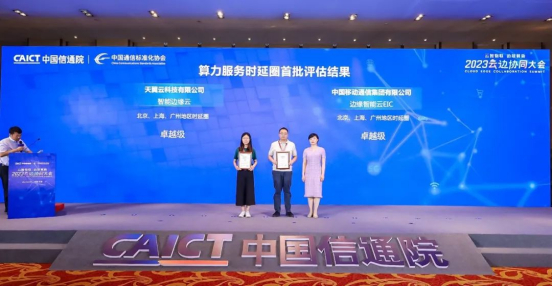 在算力服务时延圈专题行动环节的最后阶段,栗蔚为通过算力服务时延圈评估的单位颁发证书,在本次评估中,中国移动通信集团有限公司的边缘智能云EIC、天翼云科技有限公司的智能边缘云在北上广地区时延圈评估中都达到了卓越级水平。