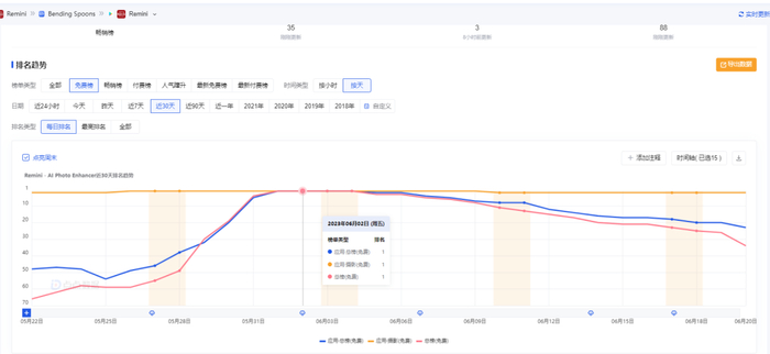 但和多数修图 App 不同,「Remini」并没有很快消失在用户视野中,而是经常重回榜单,且收入稳定增长。