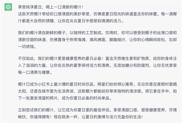 世超先让 ChatGPT 生成了一段关于椰汁的广告文案,再依次用工具进行测试。