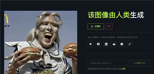 当我以为 AI or Not 稍微靠点儿谱的时候,它却说这张金角大王拿着汉堡的 AI 图片,是人类生成的。