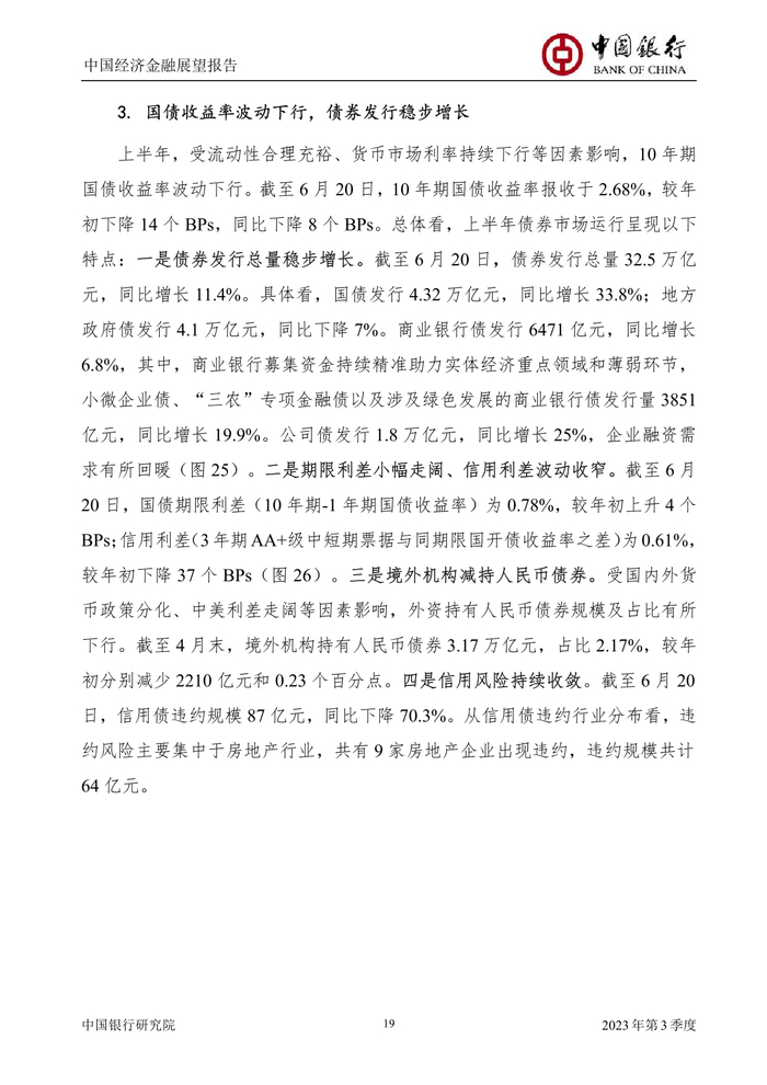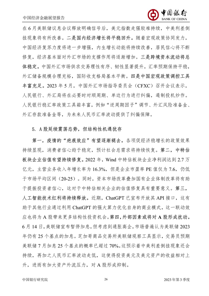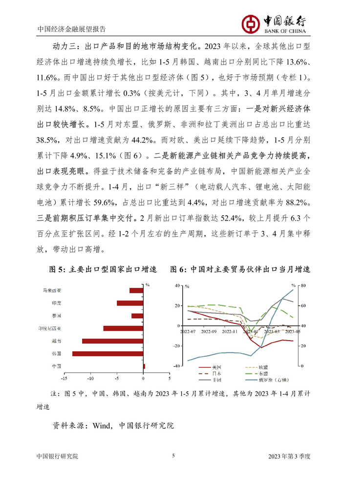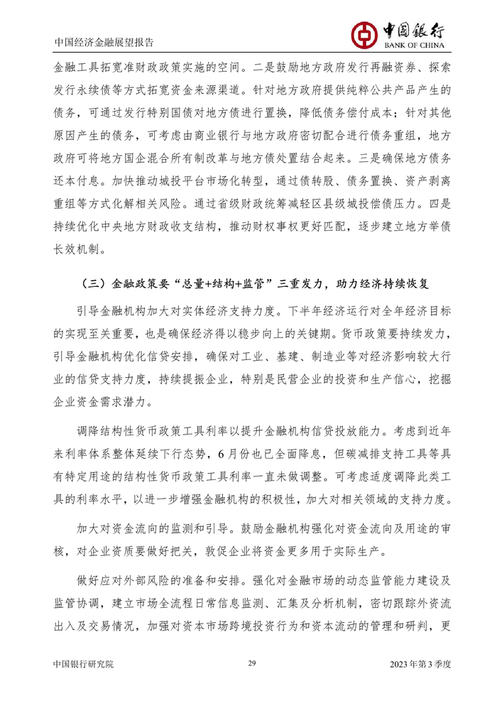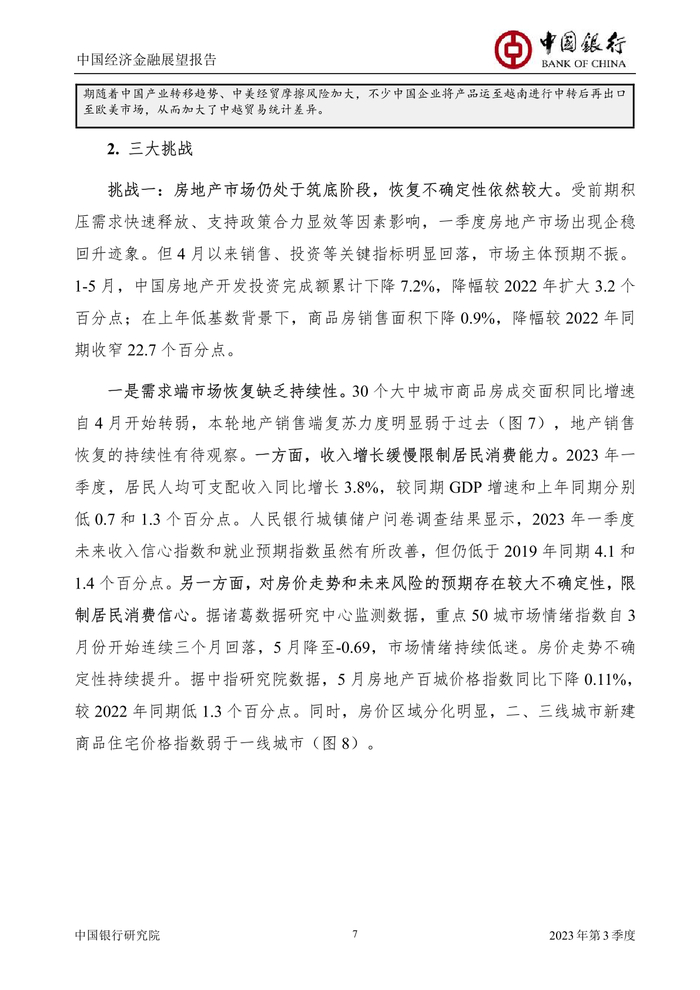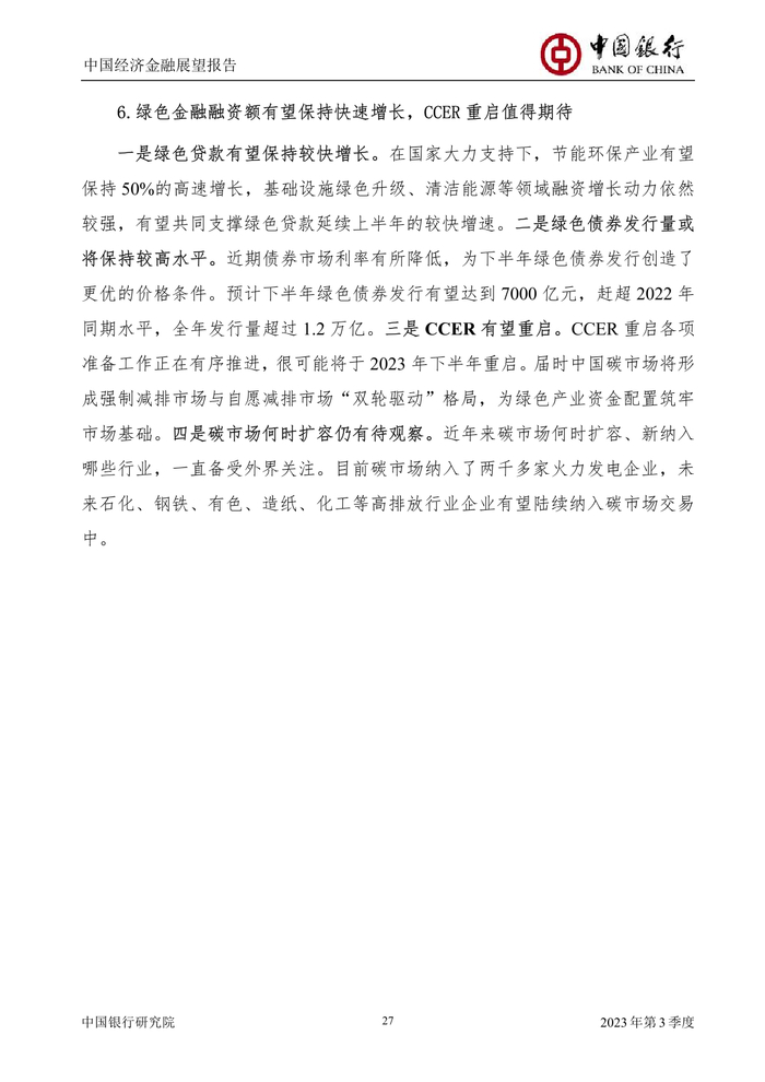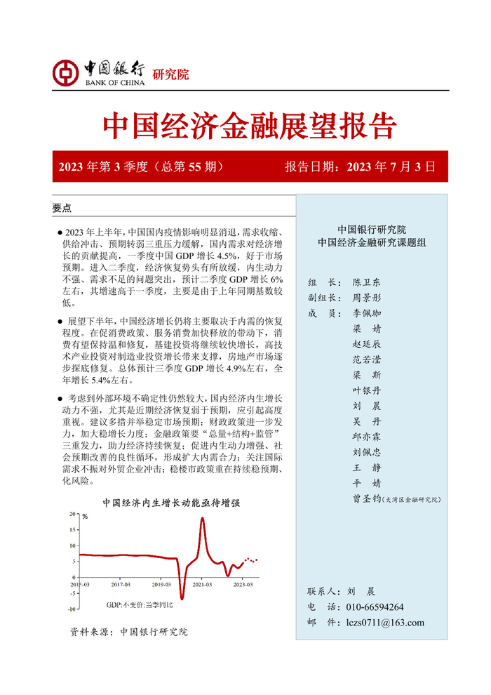 展望下半年,中国经济增长仍将主要取决于内需的恢复 程度。在促消费政策、服务消费加快释放的带动下,消 费有望保持温和修复,基建投资将继续较快增长,高技 术产业投资对制造业投资增长带来支撑,房地产市场逐 步探底修复。总体预计三季度 GDP 增长 4.9%左右,全 年增长 5.4%左右。
