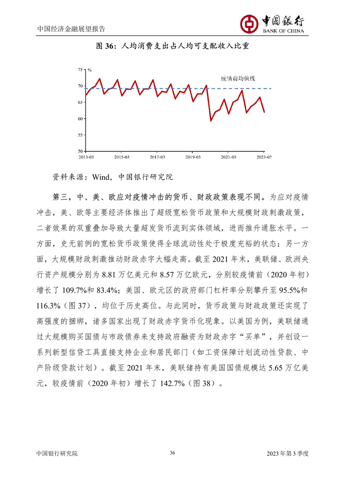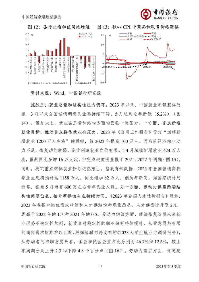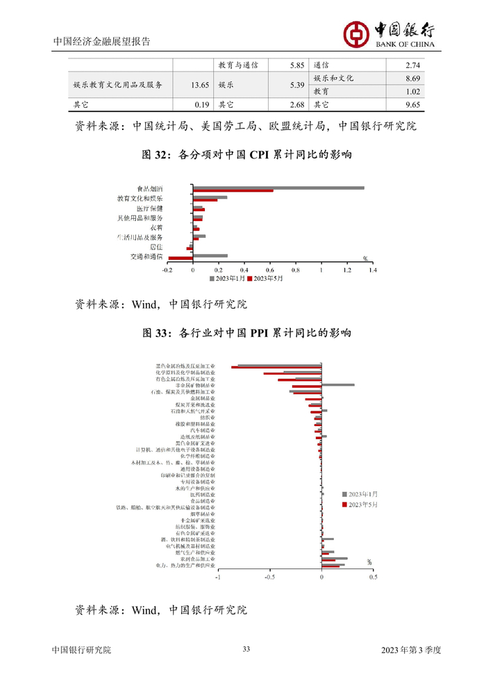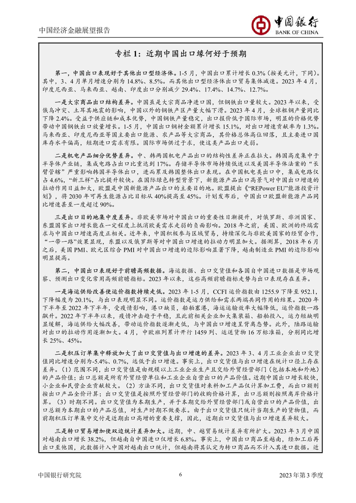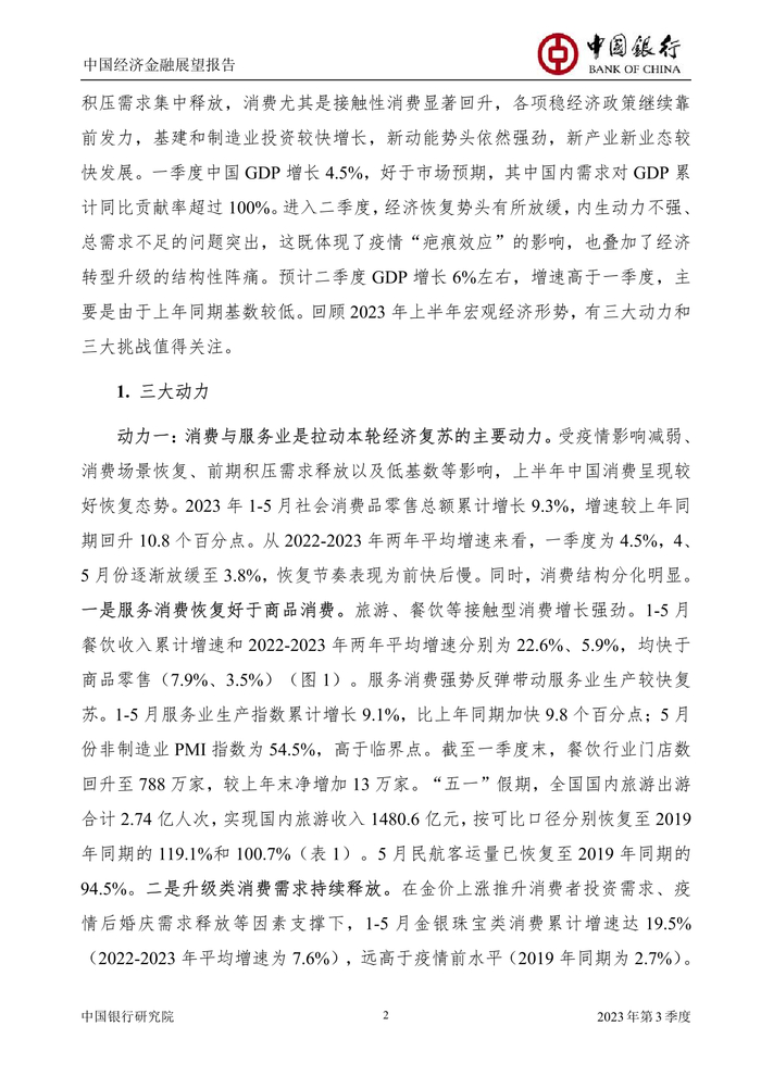 2023 年上半年,中国国内疫情影响明显消退,需求收缩、 供给冲击、预期转弱三重压力缓解,国内需求对经济增 长的贡献提高,一季度中国 GDP 增长 4.5%,好于市场 预期。进入二季度,经济恢复势头有所放缓,内生动力 不强、需求不足的问题突出,预计二季度 GDP 增长 6% 左右,其增速高于一季度,主要是由于上年同期基数较 低。
