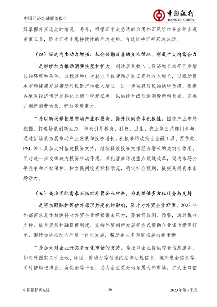 考虑到外部环境不确定性仍然较大,国内经济内生增长 动力不强,尤其是近期经济恢复弱于预期,应引起高度 重视。建议多措并举稳定市场预期;财政政策进一步发 力,加大稳增长力度;金融政策要“总量+结构+监管” 三重发力,助力经济持续恢复;促进内生动力增强、社 会预期改善的良性循环,形成扩大内需合力;关注国际 需求不振对外贸企业冲击;稳楼市政策重在持续稳预期、 化风险。