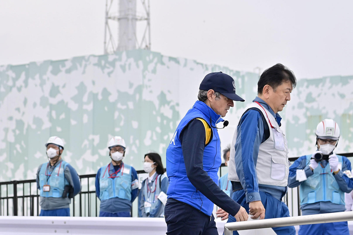 ↑7月5日,日本福岛县,IAEA总干事格罗西(前左)和东电公司社长小早川智明(前右)视察受损的福岛第一核电站设施 图据视觉中国