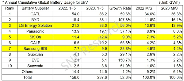 此外,韩国电池企业LG、三星和SKOn,三家厂商的综合市场份额为23.3%,同比下降了2.5%,不过他们各自市场份额都有所提升。