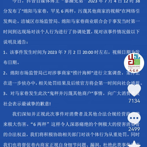通告称,7月4日,抖音自媒体博主"暴躁兄弟"当天12时38分发布了"绵阳马家巷,罕见6两秤,污蔑其他商家的视频"在网络引发舆论。涪城区市场监管局、绵阳马家巷商业联合会于事发当时第一时间到达现场对该个人行为进行了协调处置,现对该事件情况做以下说明及通告:
