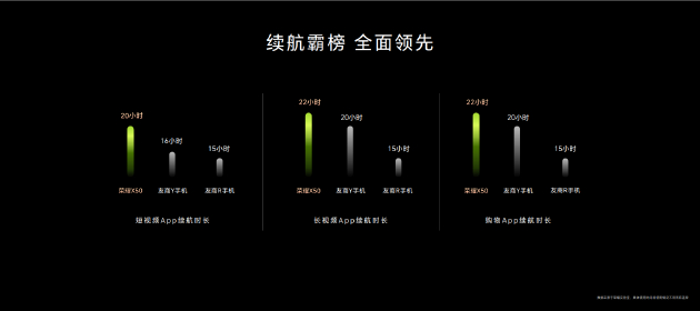 在用户高频使用场景的续航对比测试中, 荣耀X50拥有短视频APP续航20小时、长视频App及购物APP续航22小时的水平,表现远超竞品,妥妥的“续航神器”。