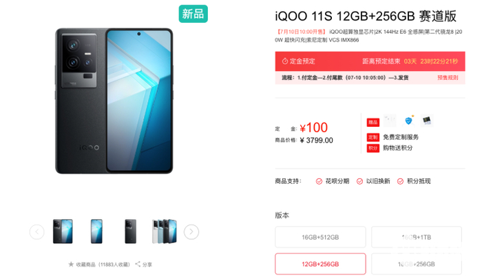 在官方平台,目前可付100元定金预订iQOO 11S,12GB+256GB版3799元;16GB+256GB版4099元;16GB+512GB版4399元;16GB+1TB版4799元。现在预订iQOO 11S,可获赠价值199元的iQOO 影音Type-C接口耳机、半年延保、趣味贴纸等礼品。
